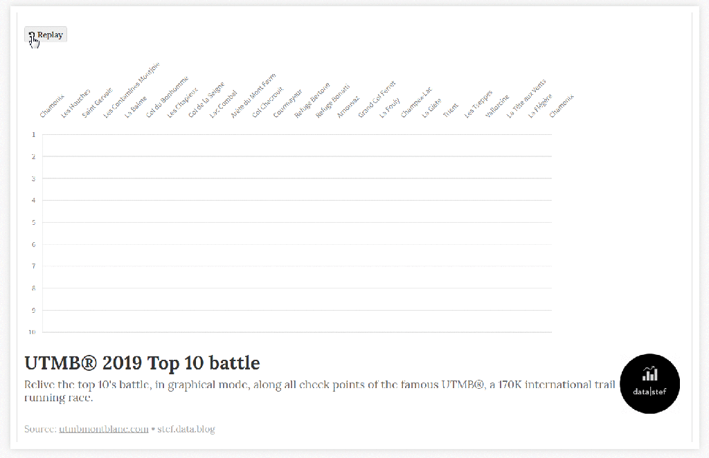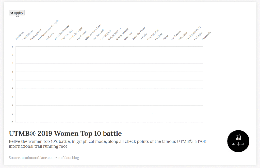 undefined Je suis fier de vous présenter ici les deux graphiques dynamiques suivants qui rejouent la bataille des 10 premiers femmes et hommes à l’UTMB® 2019 réalisés avec l’incroyable application Flourish.